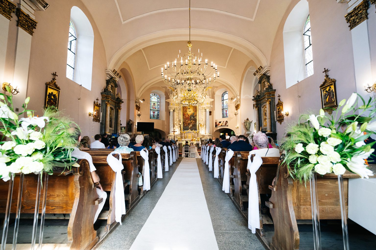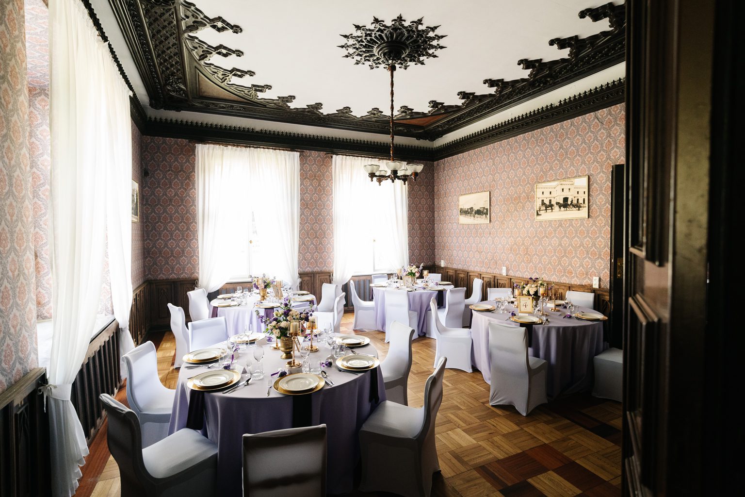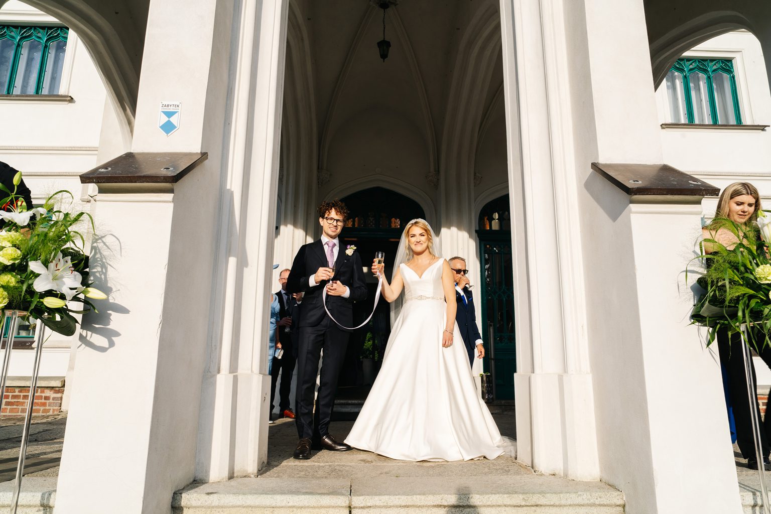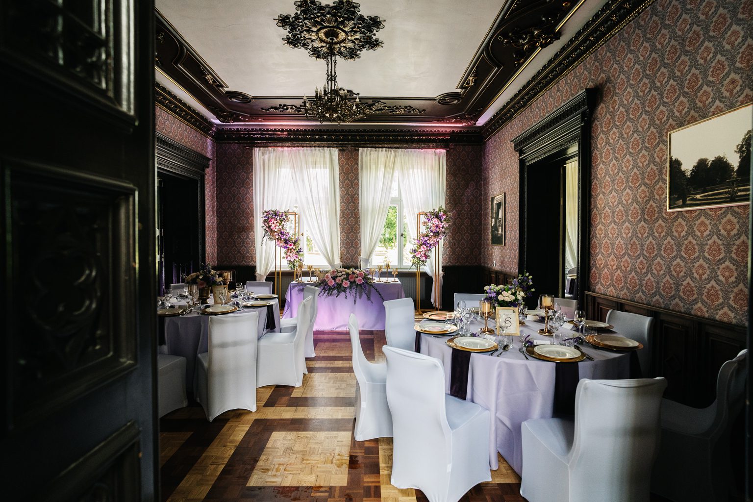 Wesele odbyło się w malowniczym pałacu, którego wnętrza zachwycały stylowymi detalami i atmosferą minionych epok. Zdobione sufity, kryształowe żyrandole i eleganckie kompozycje kwiatowe podkreśliły wyjątkowy charakter uroczystości. Przepiękna sala balowa stała się centrum wydarzeń, gdzie goście bawili się do późnych godzin nocnych.
