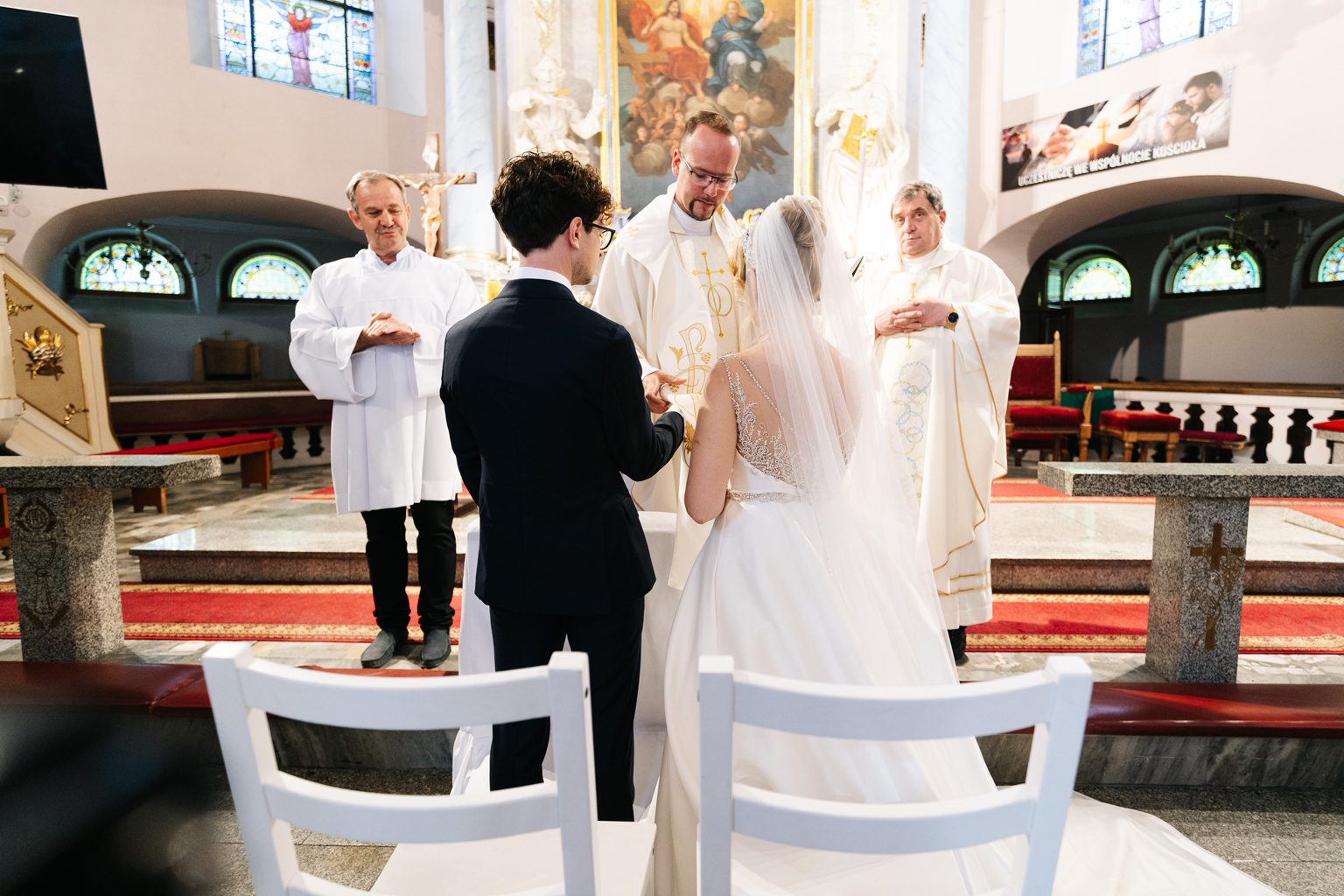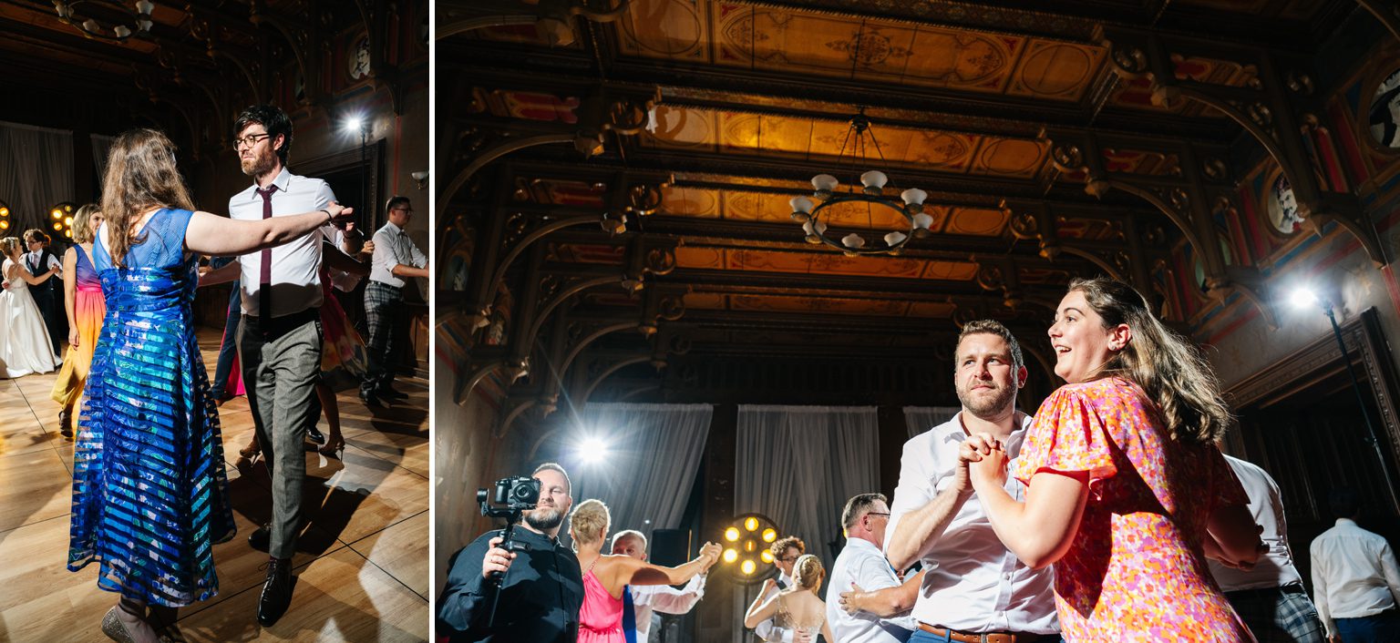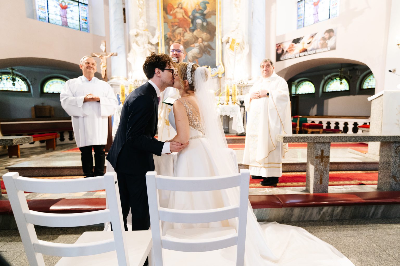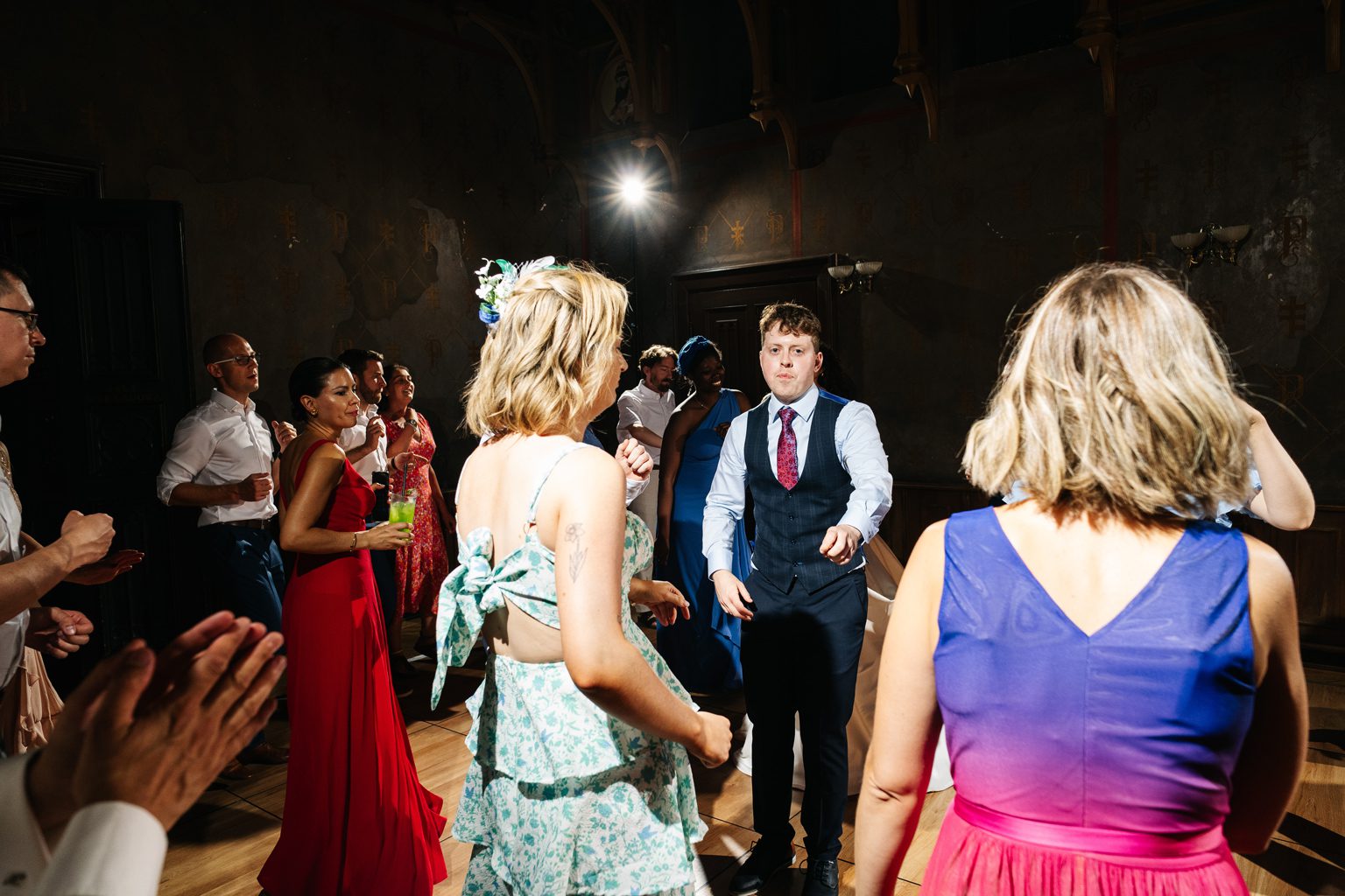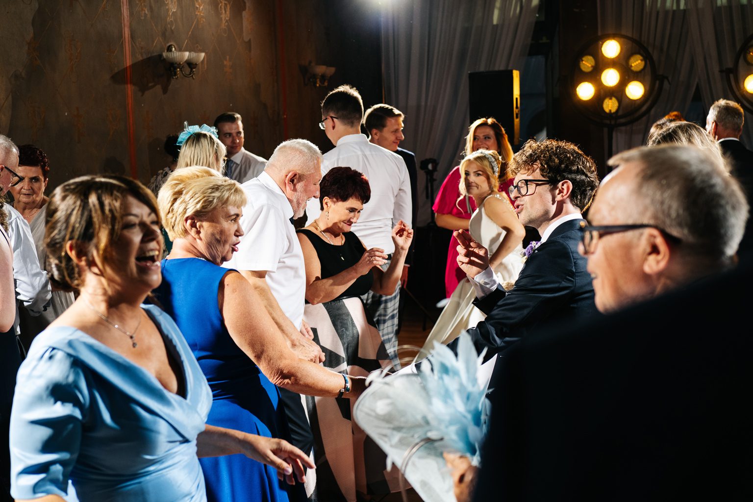 Wesele odbyło się w malowniczym pałacu, którego wnętrza zachwycały stylowymi detalami i atmosferą minionych epok. Zdobione sufity, kryształowe żyrandole i eleganckie kompozycje kwiatowe podkreśliły wyjątkowy charakter uroczystości. Przepiękna sala balowa stała się centrum wydarzeń, gdzie goście bawili się do późnych godzin nocnych.