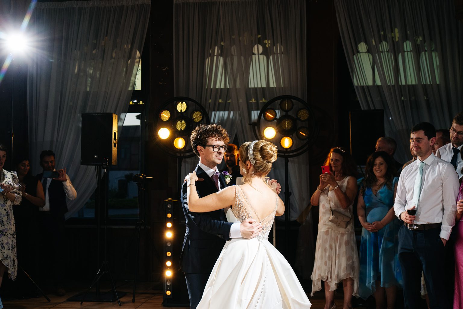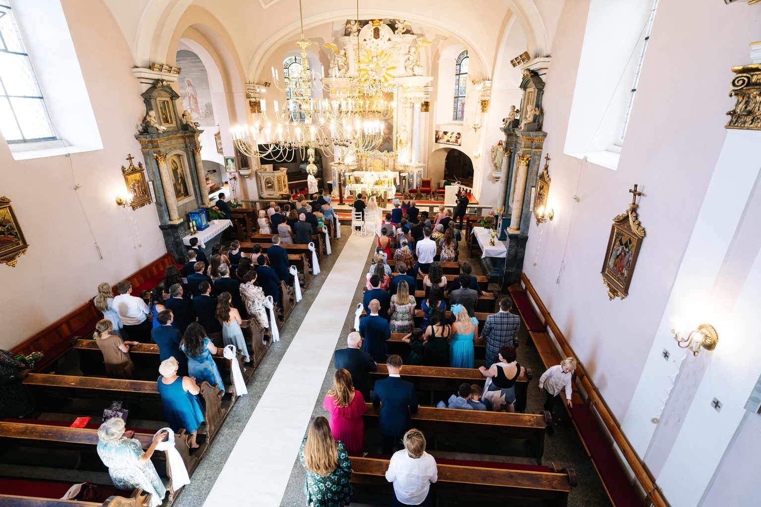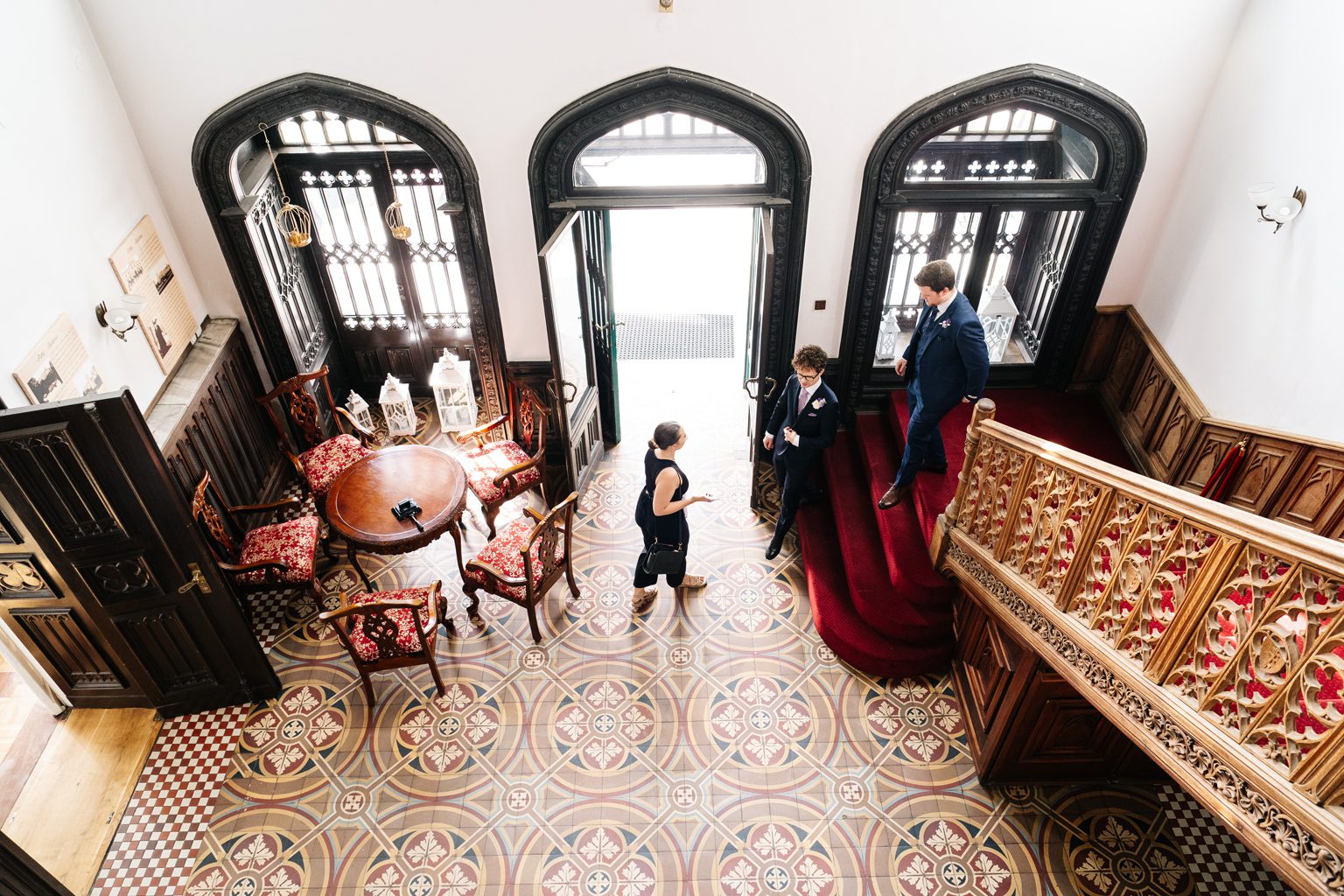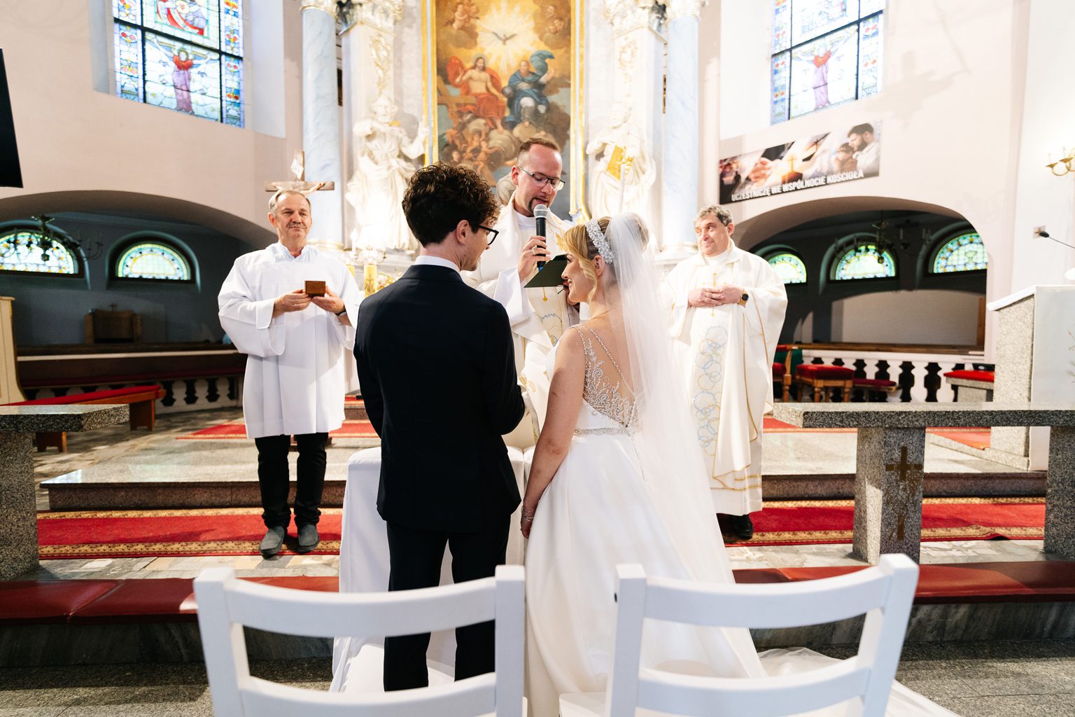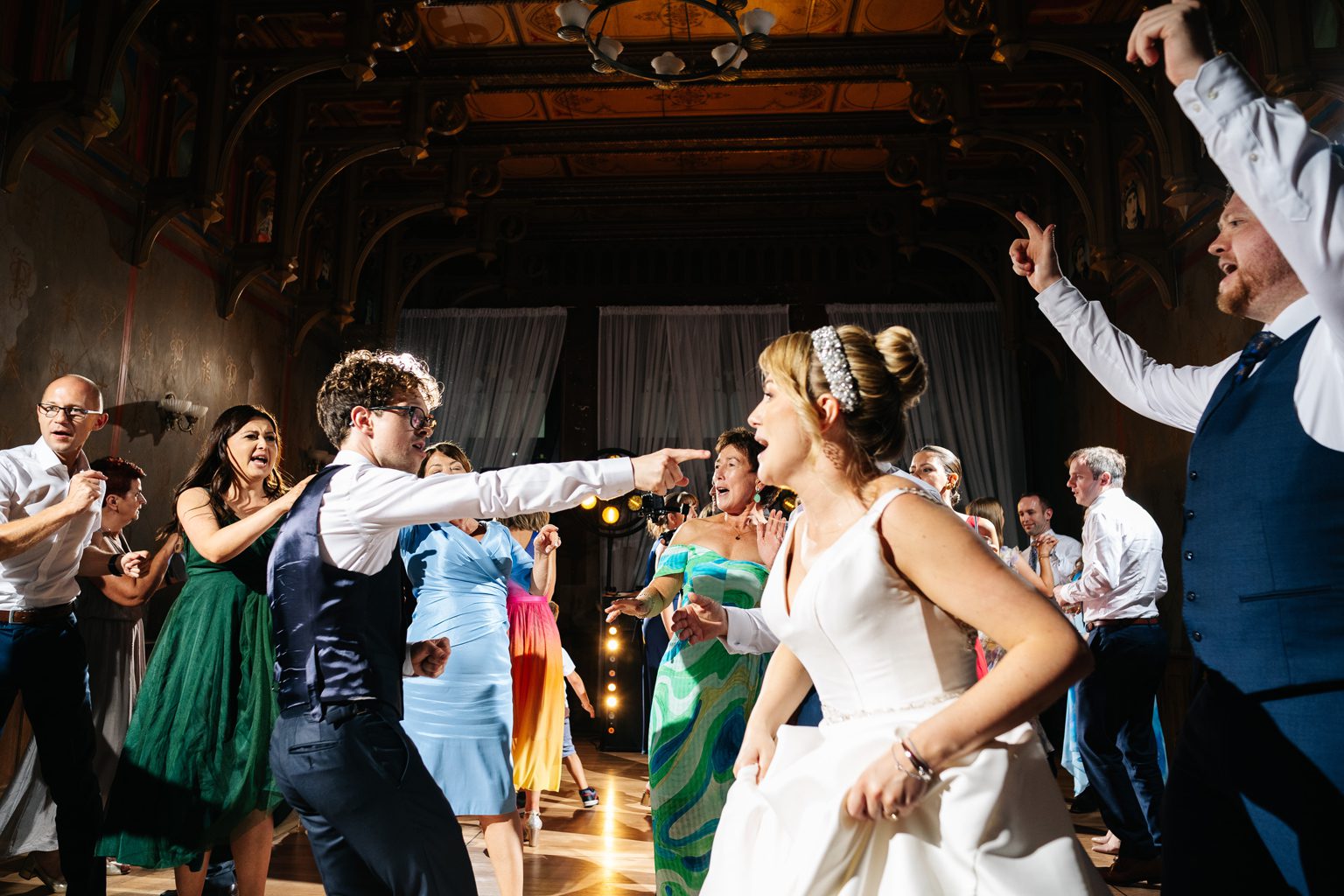 Wesele odbyło się w malowniczym pałacu, którego wnętrza zachwycały stylowymi detalami i atmosferą minionych epok. Zdobione sufity, kryształowe żyrandole i eleganckie kompozycje kwiatowe podkreśliły wyjątkowy charakter uroczystości. Przepiękna sala balowa stała się centrum wydarzeń, gdzie goście bawili się do późnych godzin nocnych.