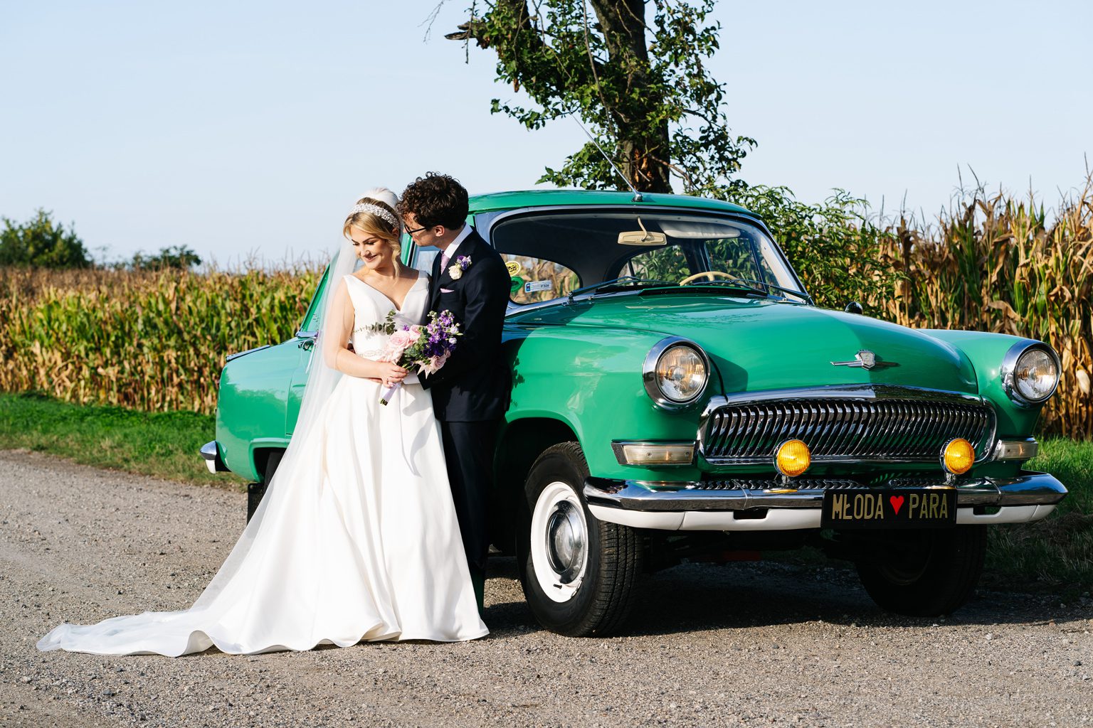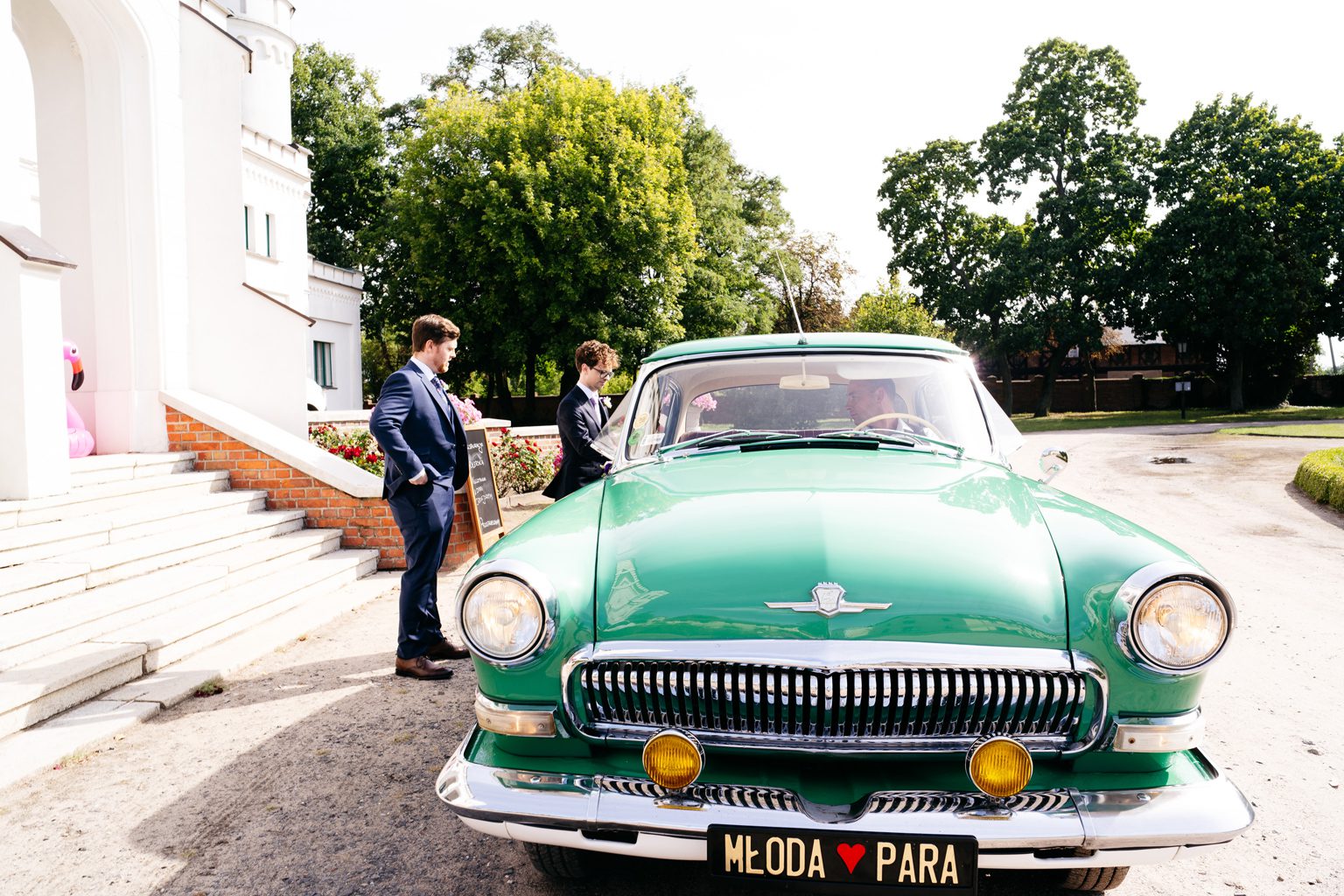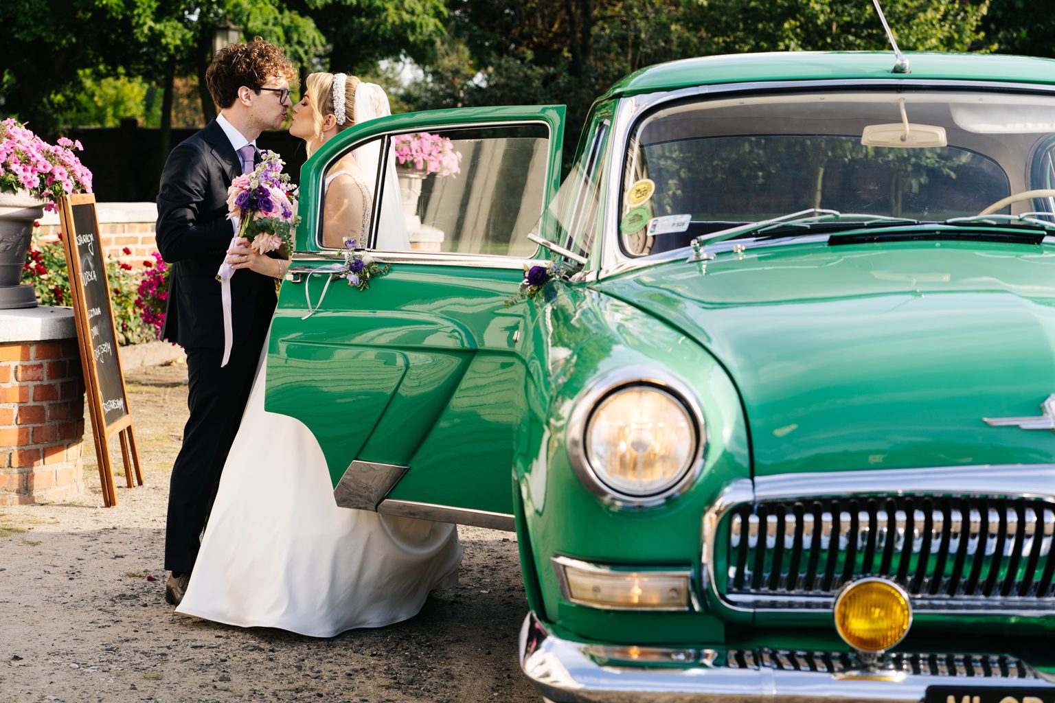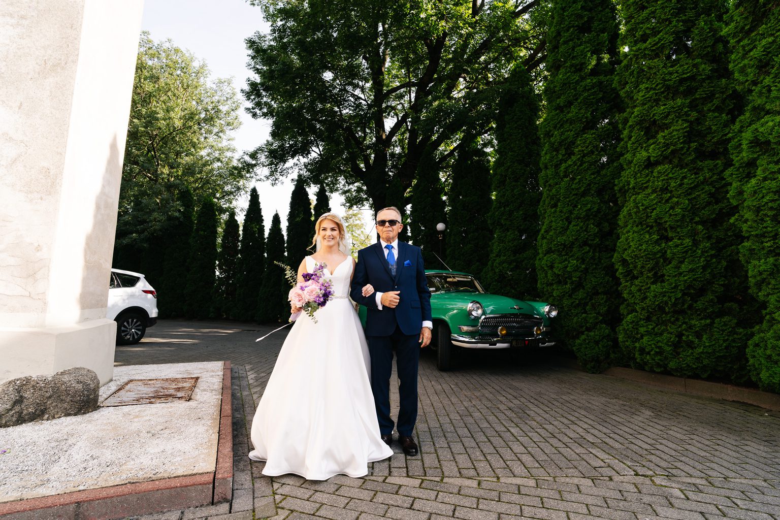 Para młoda zadała szyku, przyjeżdżając na ceremonię w klasycznym, zabytkowym aucie. Stylowe linie pojazdu i jego ponadczasowy charakter idealnie wpisały się w elegancką atmosferę dnia. Przyjazd pary młodej był jednym z najbardziej wyczekiwanych momentów, wzbudzając zachwyt zarówno wśród gości, jak i na zdjęciach.