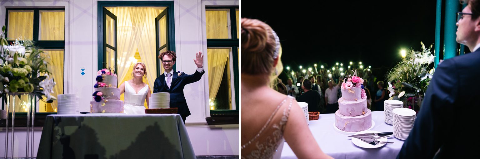 Niepowtarzalnym elementem wesela był tort weselny podany na zewnątrz, w ogrodzie otoczonym subtelnym blaskiem lampek LED z telefonów komórkowych gości. Ta romantyczna sceneria stworzyła magiczną atmosferę, której nie sposób zapomnieć.