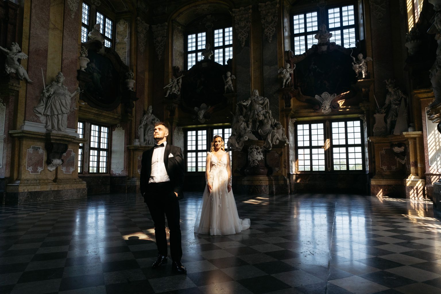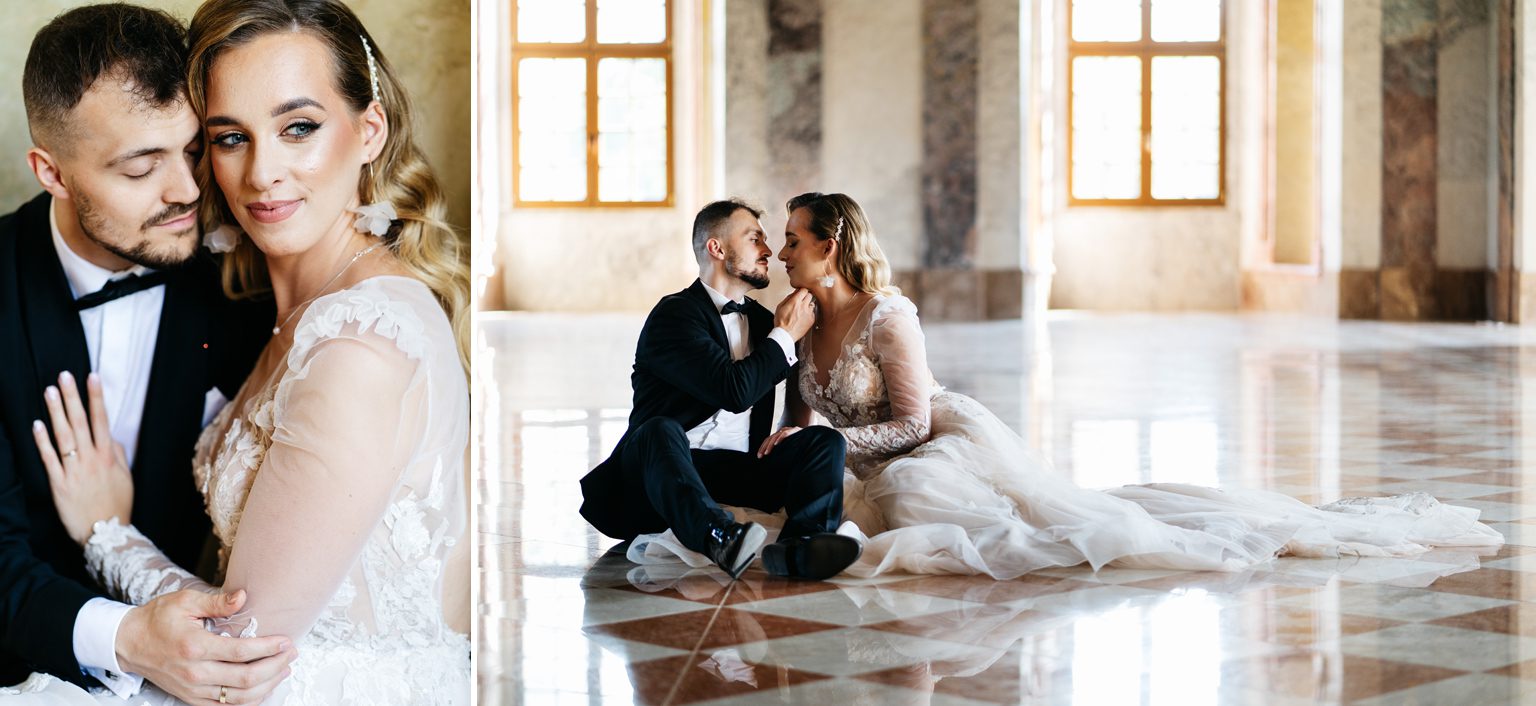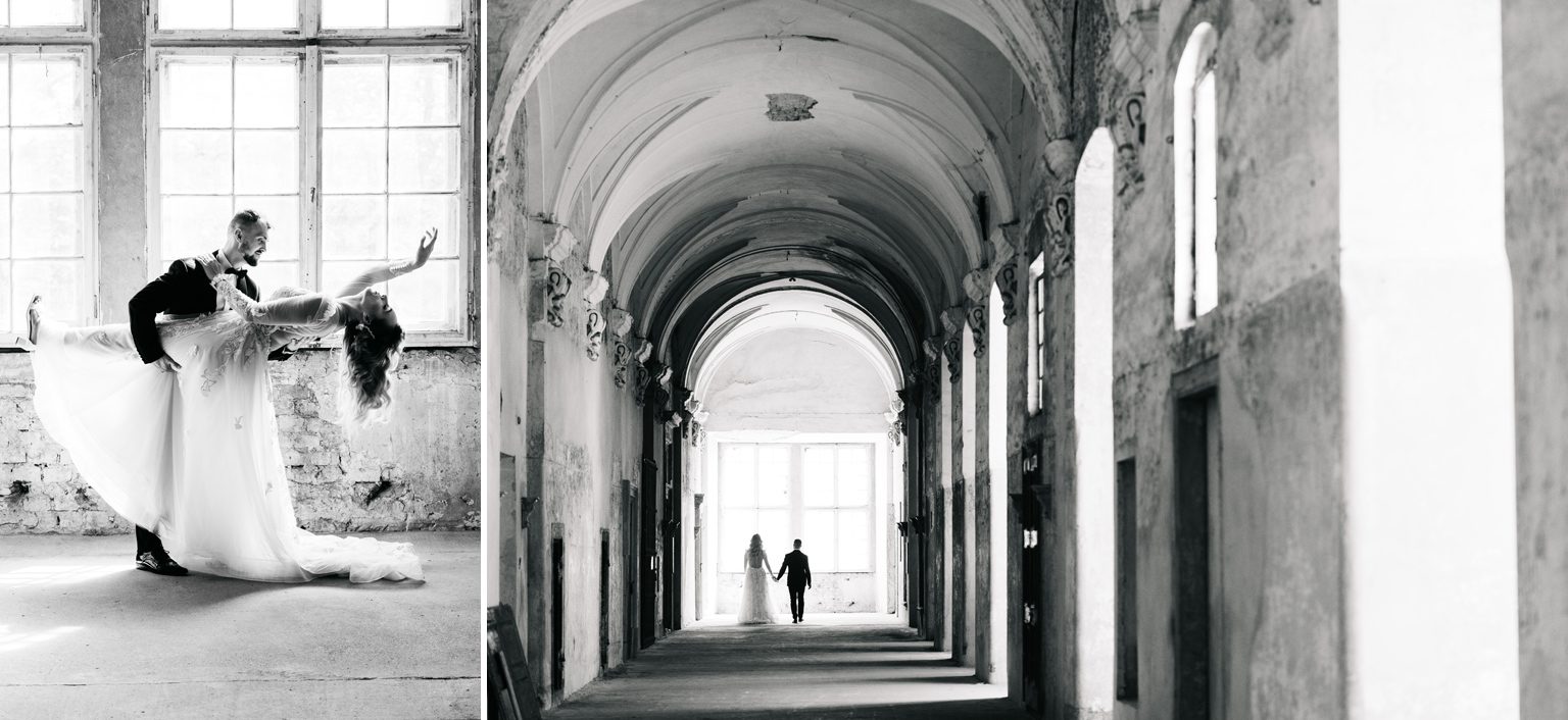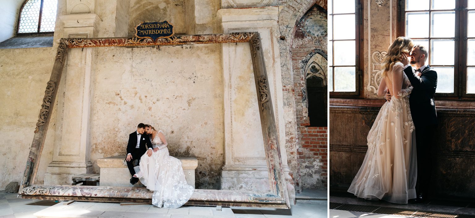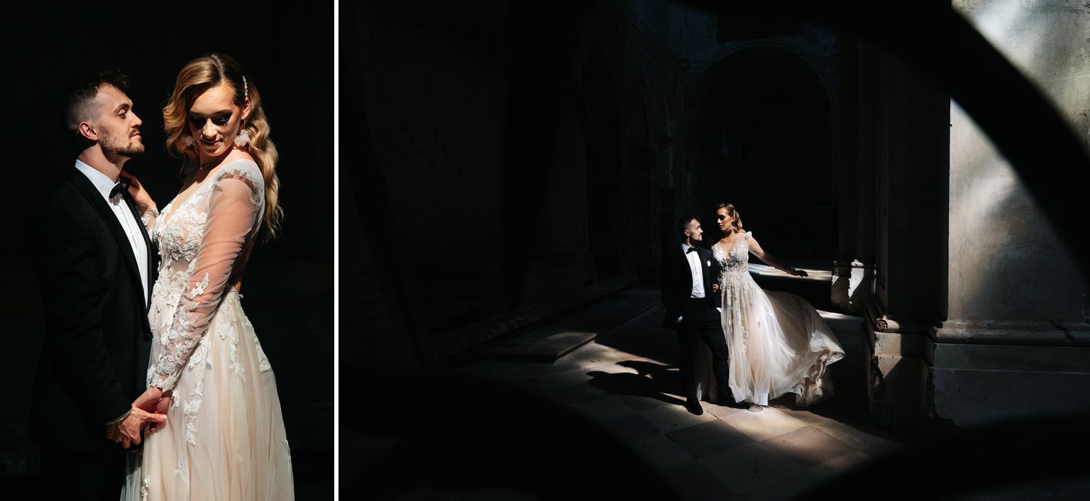 Kilka dni później spotkaliśmy się ponownie – tym razem w zupełnie innym klimacie – w opactwie w Lubiążu, które okazało się idealnym tłem do ich romantycznej sesji plenerowej. Monumentalne wnętrza, światło i ta ich wyjątkowa chemia stworzyły kadry, które mówią same za siebie.