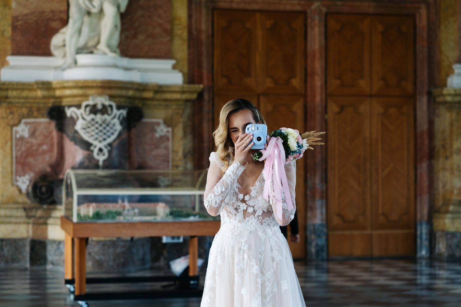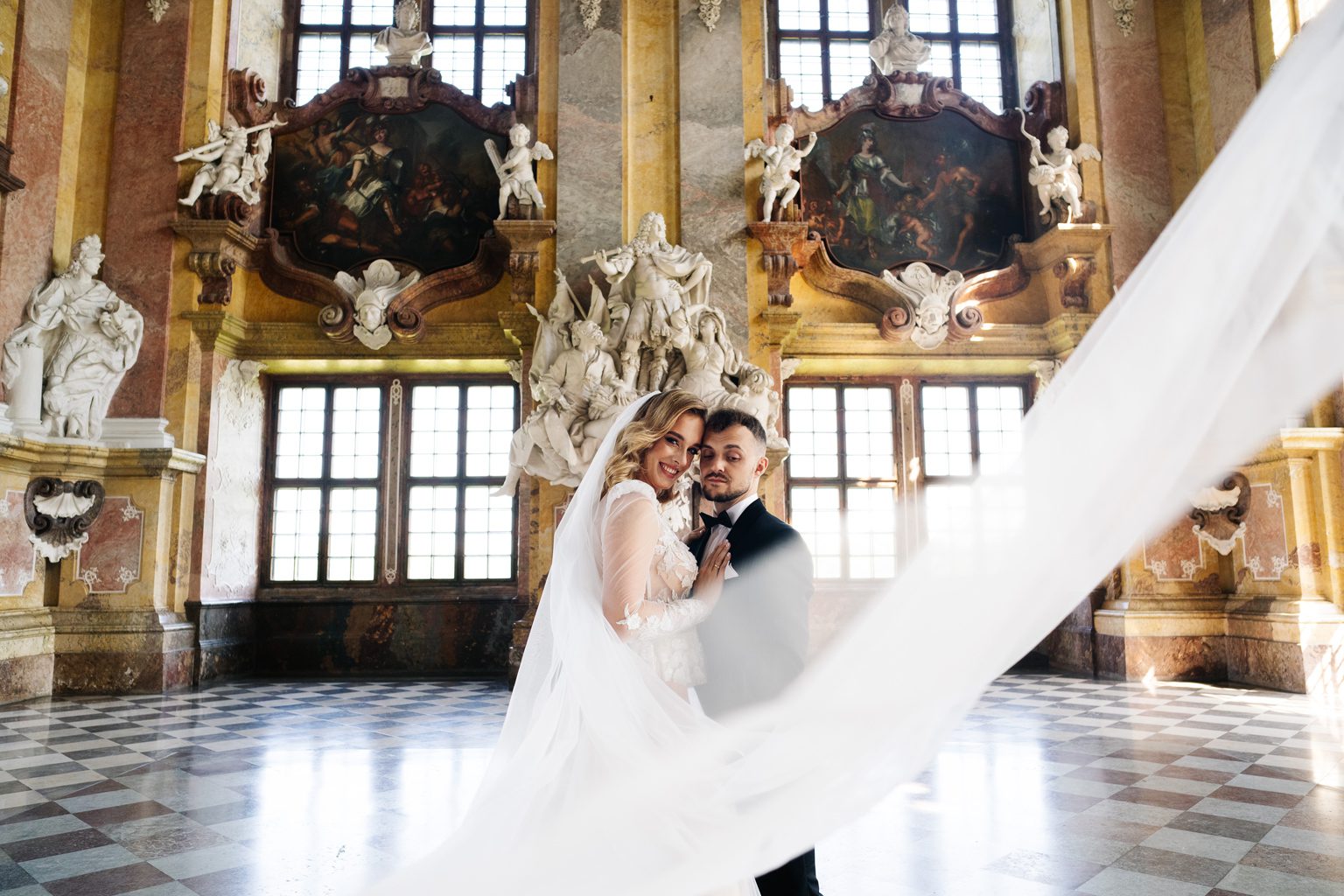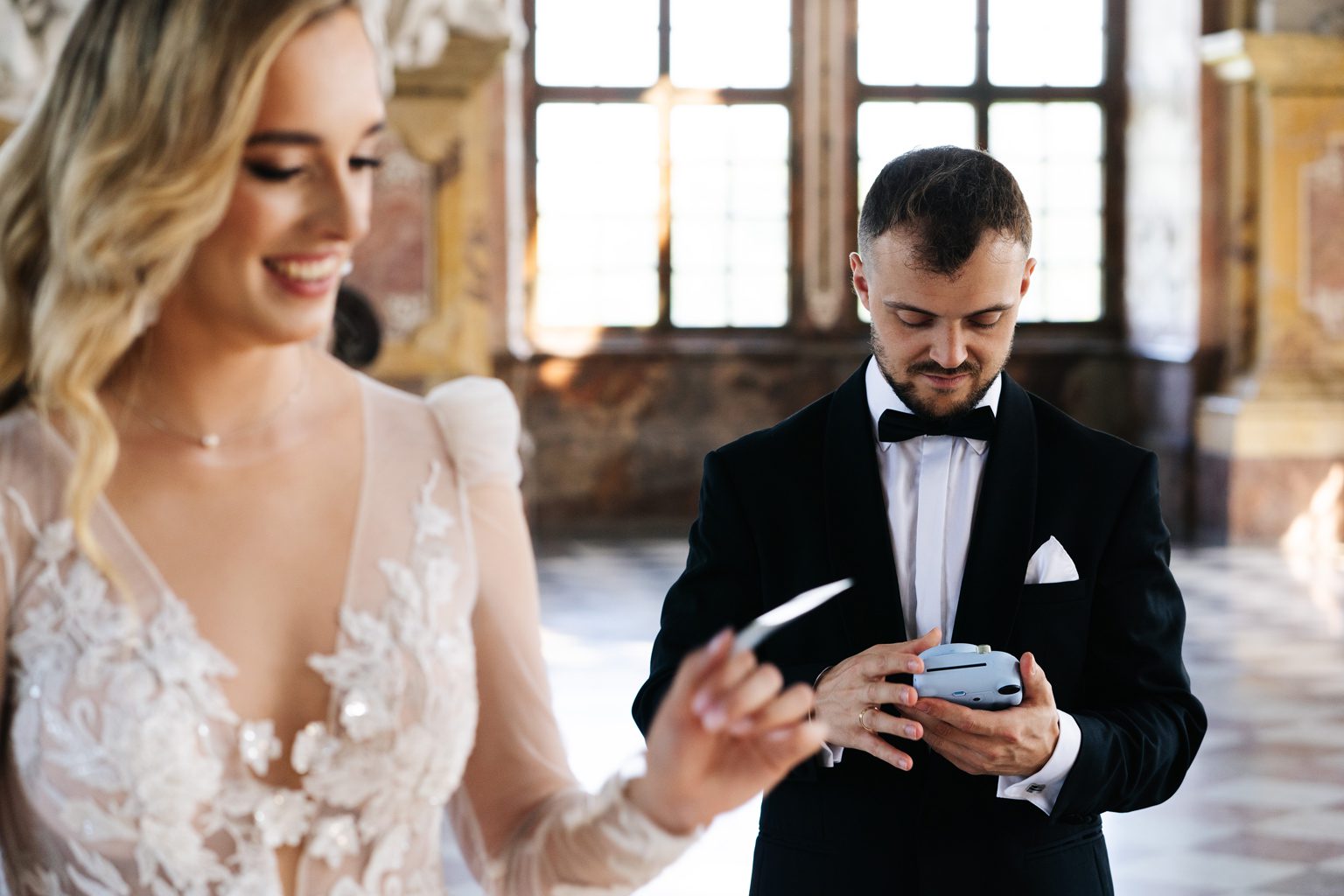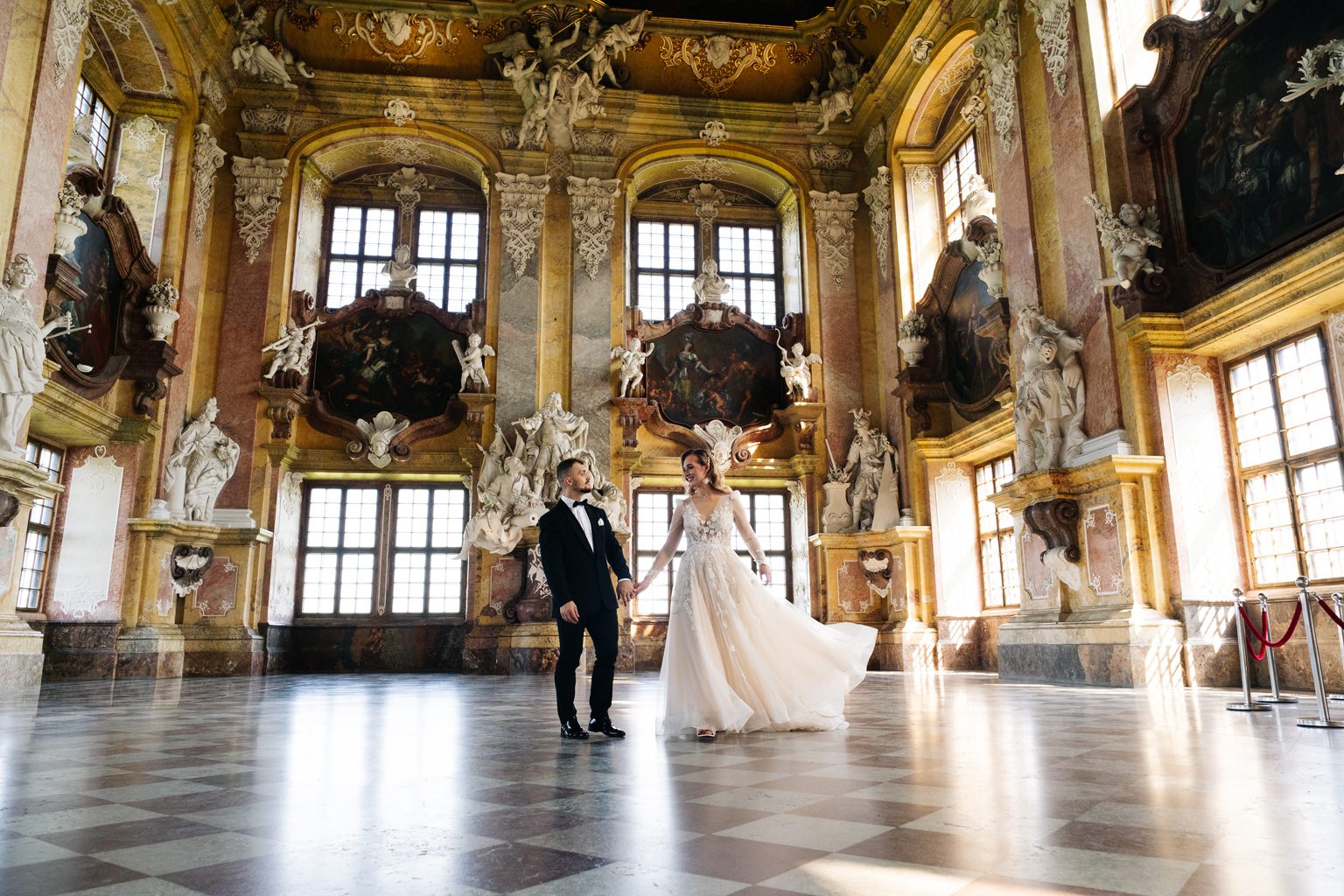 Kilka dni później spotkaliśmy się ponownie – tym razem w zupełnie innym klimacie – w opactwie w Lubiążu, które okazało się idealnym tłem do ich romantycznej sesji plenerowej. Monumentalne wnętrza, światło i ta ich wyjątkowa chemia stworzyły kadry, które mówią same za siebie.